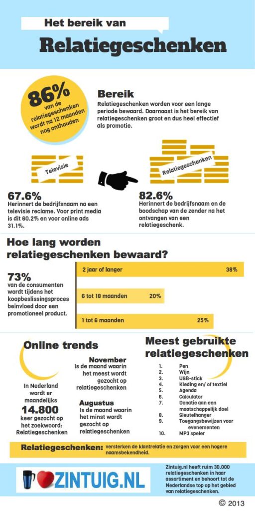 - 86% van de relatiegeschenken worden het herinnerd na 12 maanden.