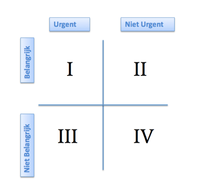 Covey adviseerde daarom om te werken met de timemanagement-matrix, ook wel bekend als de Eisenhower-kwadranten. In dit model maak je onderscheid tussen urgentie en belangrijkheid. Het doel is je tijd alleen maar te besteden aan zaken die belangrijk zijn en de niet belangrijke dingen links te laten liggen, kwadrant I en II dus.