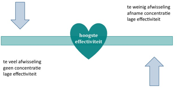 Het is dus belangrijk dat je in je werkdag zorgt voor een goede afwisseling tussen inspanning en ontspanning, tussen activiteiten die je opperste concentratie vragen en activiteiten waarin je minder geconcentreerd hoeft te zijn. Een goed ritme in de dag kan je hierbij helpen. Een globaal ritme kan bijvoorbeeld zijn: 2 uur doewerk – pauze – 1,5 uur concentratiewerk – lunch – 2 uur doewerk – pauze – 1,5 uur concentratiewerk – afsluiten van de dag.